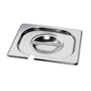 The MixRite 325mm x 265mm Stainless Steel Lids with Cut outs for Spoons are designed to accommodate a serving spoon or ladle, making them suitable for 1/2 GN pans containing soups, stews, sauces, and more. They are made from hard-wearing stainless steel for durability and easy cleaning.